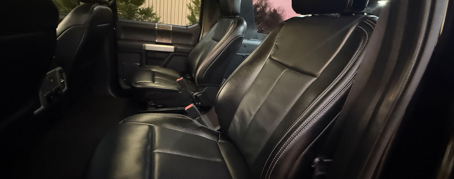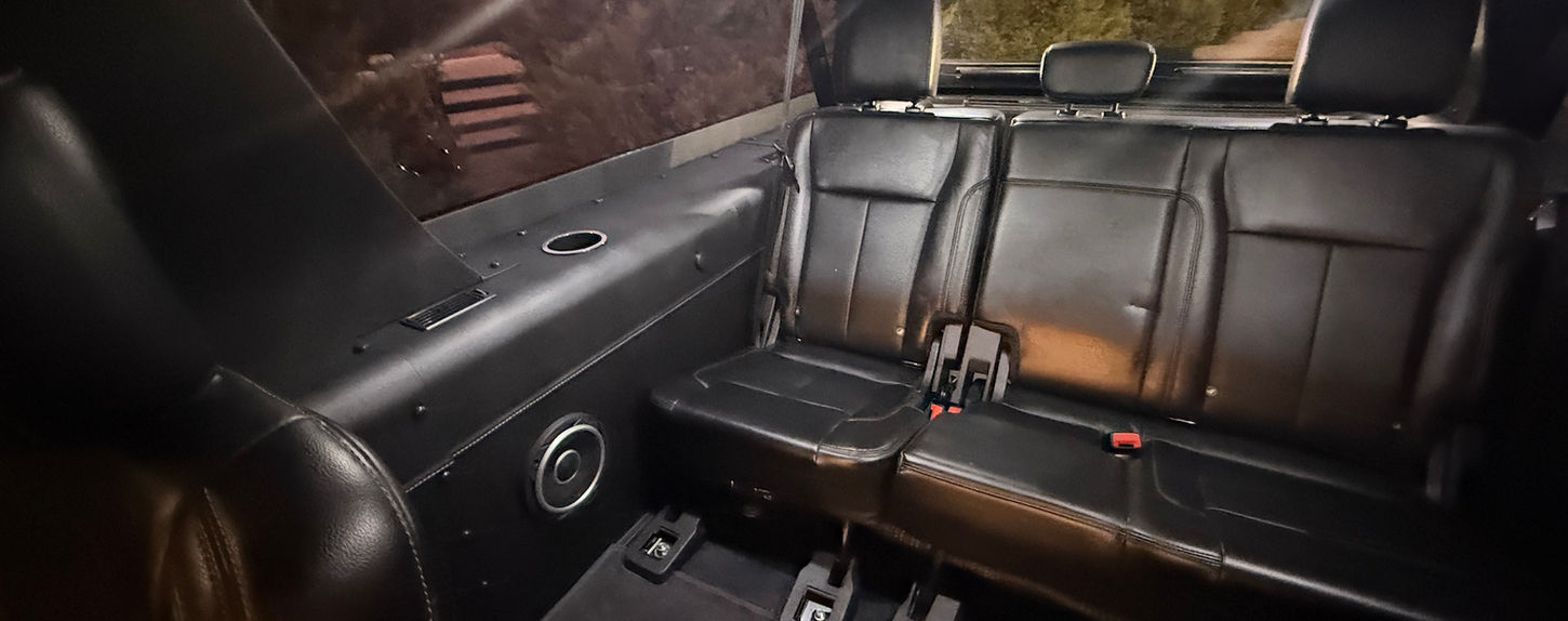 Black powder-coated tubular side steps provide effortless entry into a richly appointed interior. A twin-panel panoramic power moonroof floods thecabin with natural light, illuminating heated and ventilated front seats upholstered in Black Onyx micro-perforated premium leather with driver-side memory. The second-row captain’s chairs and power-folding third-row bench—sourced from the Ford®Expedition®—are trimmed to match, maintaining a unified, factory-quality aesthetic throughout.